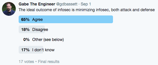 Why is this the right outcome? Good question. It captures multiple things at once. Breaches can be considered a cost associated with infosec and so are captured. However, it'd be naive to think that all costs attackers cause are associated with breaches (or even incidents). The generality of the definition allows it to be inclusive. It also captures the flip side: the goal of minimizing defenses. This is easy to miss, but critical to organizations. There is no benefit to infosec if the cost of stopping attacks is worse than the cost of the attacks. Ideally, stopping attacks would have zero cost of resources (though that is practically impossible). This outcome is also vague about the unit to be minimized allowing flexibility. (It doesn't say 'minimize cost' or 'minimize time'.) Ultimately it's up to the organization to measure this outcome. How they choose to do so will determine their success.