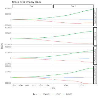 What we see is a relatively slow beginning game. This is due to beacons initially being scored below the scoring profile and one of three highly-scored puzzle servers being mistakenly scored lower from it's start late in day 1 until it was corrected at the beginning of day 2.