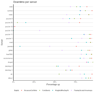 This year we added additional servers coming on and off line at various times as well as began the process of updating the gray team's role by allowing them to play a puzzle challenge hosted on the blue team servers.
