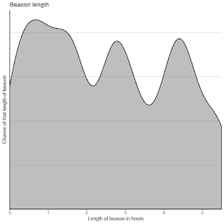 Based on this we ran Monte Carlo simulations to try and predict the outcome of the game.### Define distributions to sample from## Based on previous games/simulations and expert opinion# H&W outage distributionsdoutage_count <- distr::Norm(mean=8, sd = 8/3)doutage_length <- distr::Norm(mean=1, sd = 1/3)# flag distributionsdflags <- distr::Norm(mean=2, sd= 2/3) # model 0 to 4 flags lost with an average of 2# beacon distributionsgamma_shapes <- rriskDistributions::get.gamma.par(p=c(0.5, 0.7), c(0.75, 4)) # create a gamma distribution to draw number of tickets fromdbeacons_length <- distr::Gammad(shape=gamma_shapes['shape'], scale=1/gamma_shapes['rate']) # in hoursdbeacon_count <- distr::Norm((4-3)/2+3, (4-3)/3)