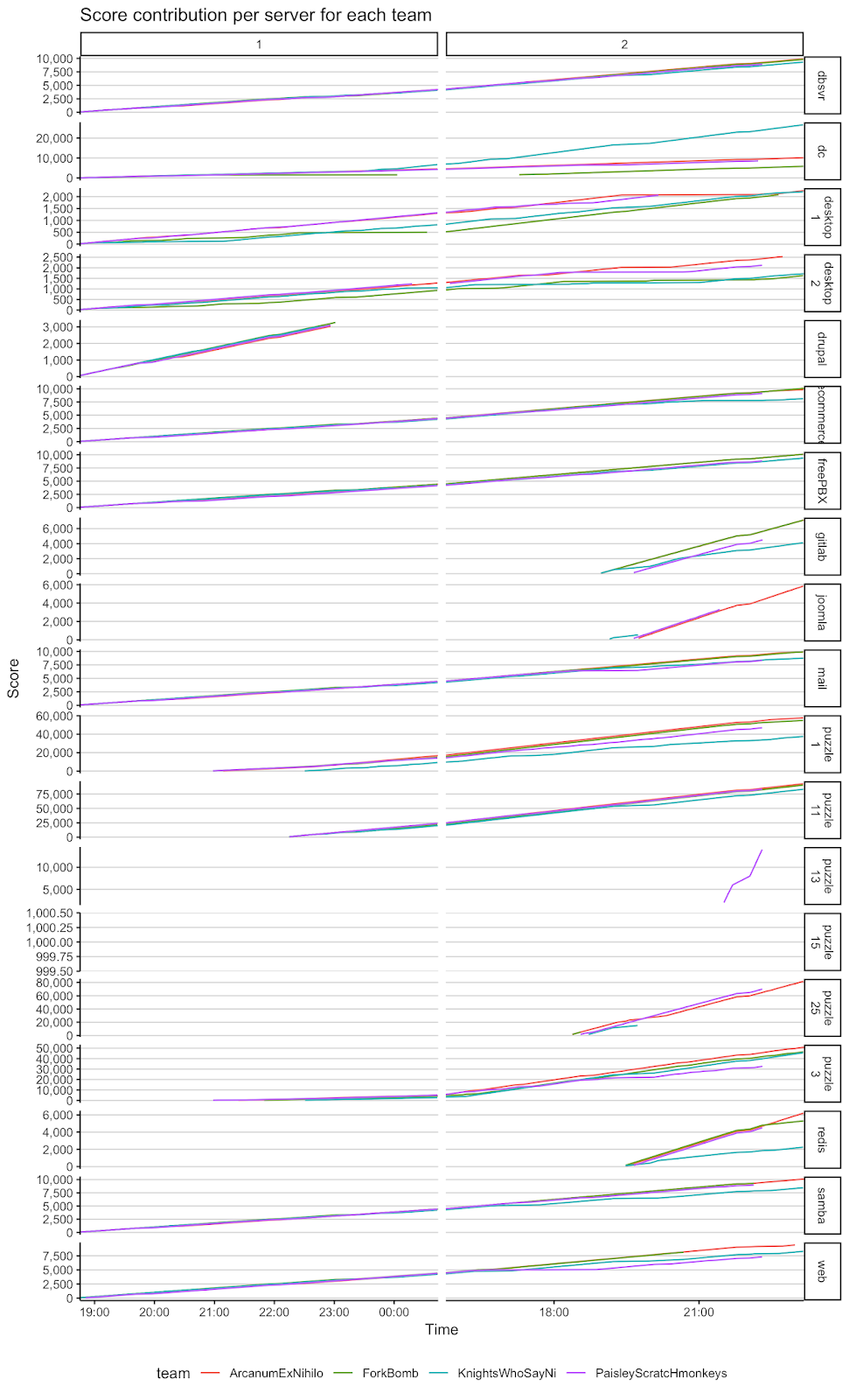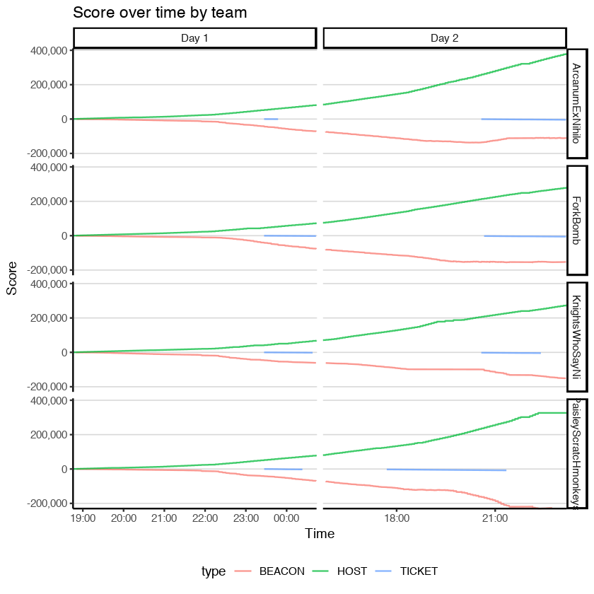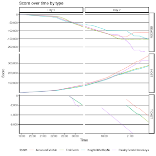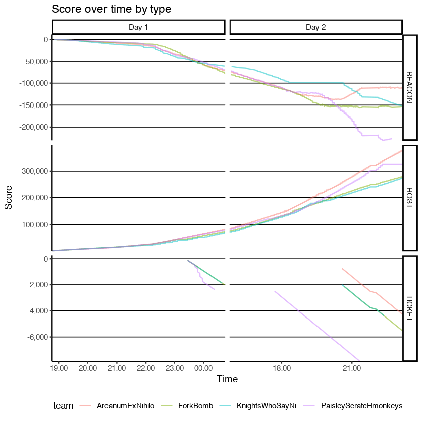 We do see an amount of trading back and forth. ForkBomb (as an aside, I know they wanted the _actual_ fork bomb code for their name, but for this analysis text is easier) takes an early lead while Knights suffer some substantial losses (relative to the current score). Day two scores take off. The teams are relatively together through the first half of day 2, however, Arcanum takes off mid-day and doesn't look back.