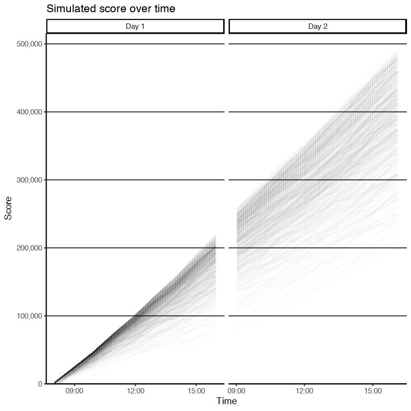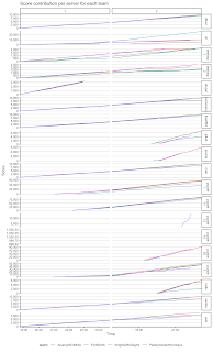 The first question is how did the scores progress over time? (You'll have to forgive the timestamps as they are still in UTC I believe.) What we hoped for was relatively slow scoring the first two hours of the game. This allows teams the opportunity to make up ground later. We also do not want teams to follow a smooth line or curve. A smooth line or curve would mean very little was happening. Sudden jumps up and down, peaks and valleys, mean the game is dynamic.