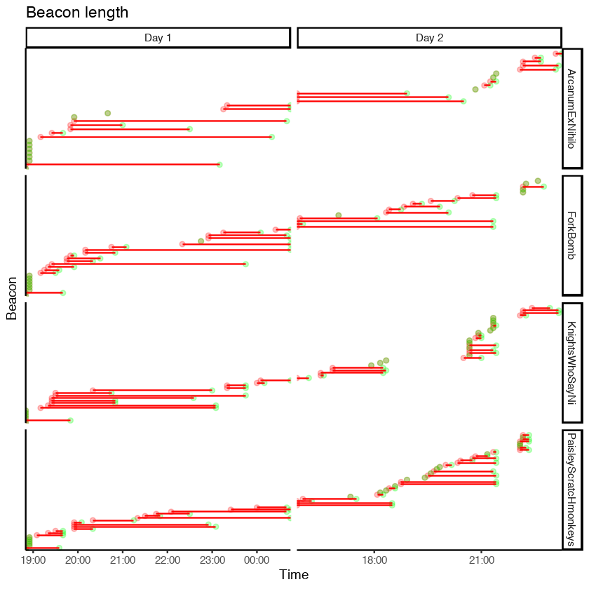 The biggest difference is in beacons. We see several interesting things. First, for a period on day two, Knights employed a novel (if ultimately overruled) method for preventing beacons. We see that in the level beacon score for an hour or two. We also see a shorter level score in beacons later on when the red team employed another novel (if ultimately overruled) method that was significant enough that had to be rolled back. We also see how Arcanum benefited heavily from the day 2 rule allowing blue-on-blue aggression. Their beacon contribution actually goes UP (meaning they were gaining more score from beacons than they were losing) for a while. On the other side, Paisley suffers heavily from blue-on-blue aggression with significant beacon losses.