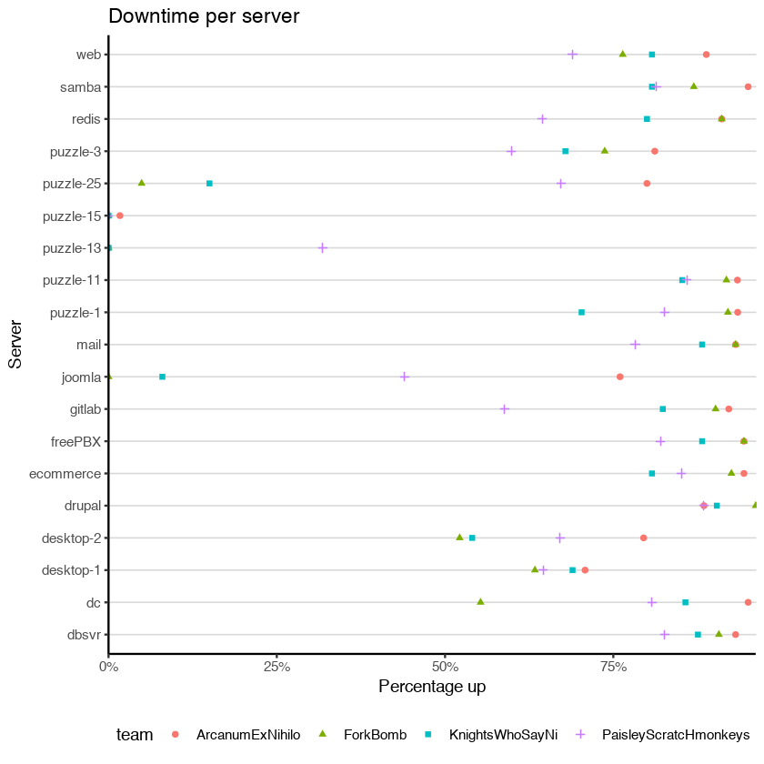More interesting are the differences in scoring for servers such as Redis, Gitlab, and Puzzle-1. This suggests maybe these servers are harder to defend as they provided score differentiation. Also, we notice teams strategically disabling their domain controller. This suggests the domain controller should be worth more to disinsentivize this approach.