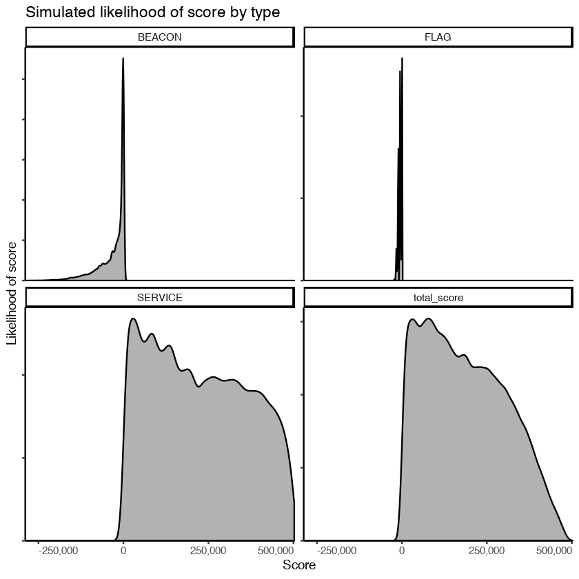 Finally we wanted to look at the distributions of potential final scores and the contributions from the individual scoring types