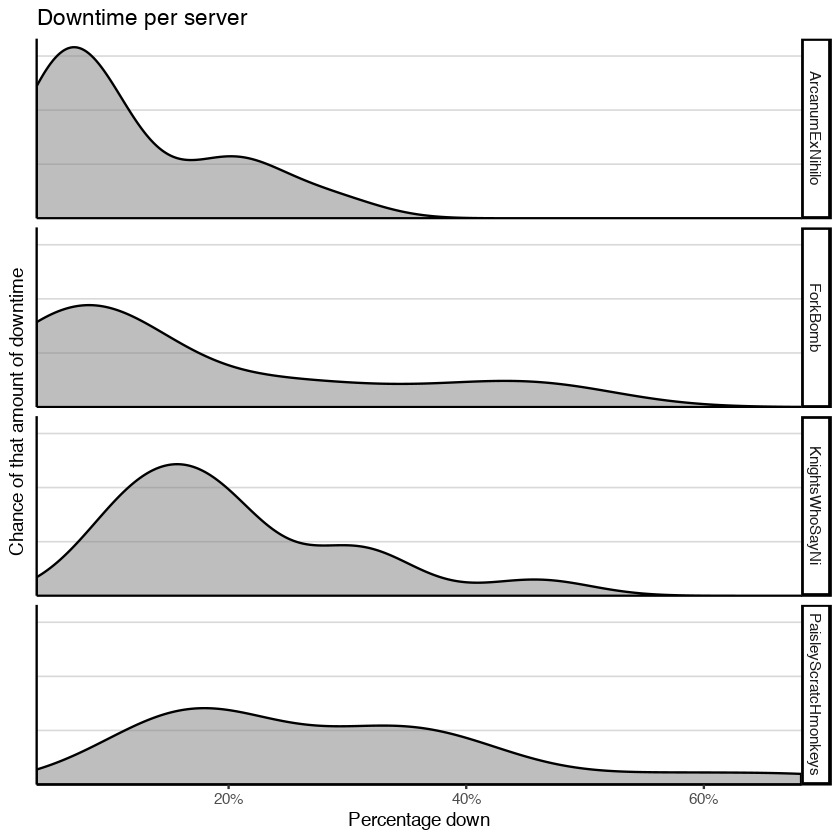 We then try and build distributions of how likely servers will be to go offline, how likely beacons will be and how long they will last, and how many flags will be found. This year we used previous years simulations and logs as well as expert opinion to build the distributions. The distributions we used are below: